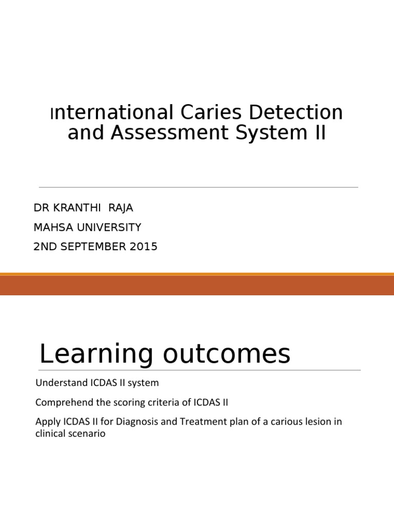 The icdas criteria were developed by an international team of caries researchers to integrate several new criteria systems into one standard system for caries detection and assessment.